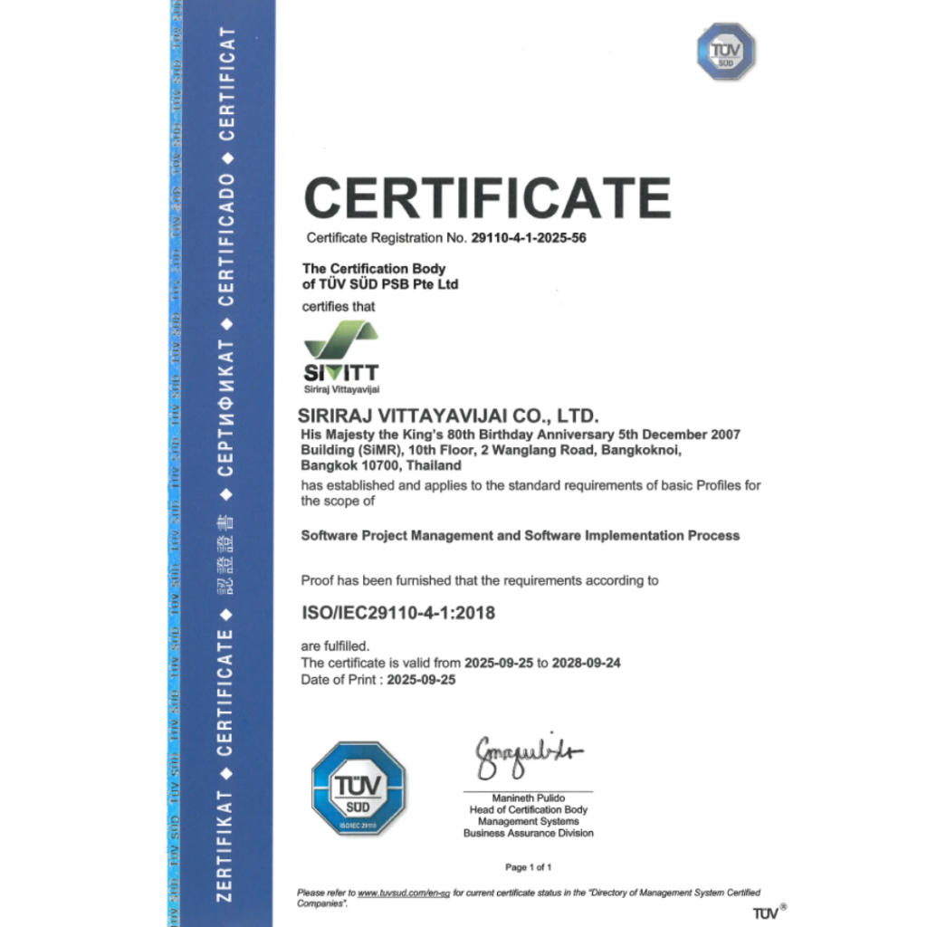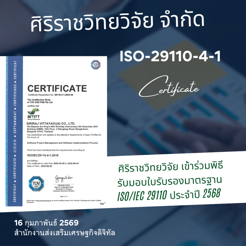 บริษัท ศิริราชวิทยวิจัย จำกัด เข้าร่วมพิธีรับมอบใบรับรองมาตรฐาน ISO/IEC 29110 ประจำปี 2568 ภายใต้โครงการดำเนินงานเพื่อขอรับรองมาตรฐาน ISO/IEC 29110 ให้กับผู้ประกอบการ ตามมาตรการคูปองดิจิทัลเพื่อการรับรองมาตรฐานด้านดิจิทัล ประจำปีงบประมาณ 2568 ซึ่งจัดขึ้นเพื่อส่งเสริมและยกระดับศักยภาพผู้พัฒนาซอฟต์แวร์ไทยให้มีระบบการทำงานที่ได้มาตรฐานสากล
