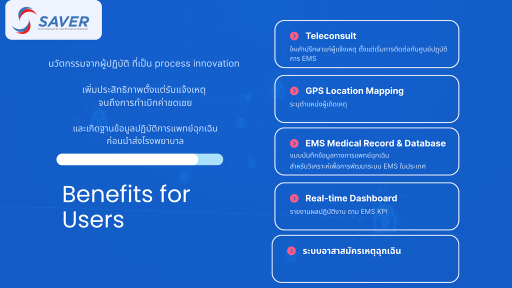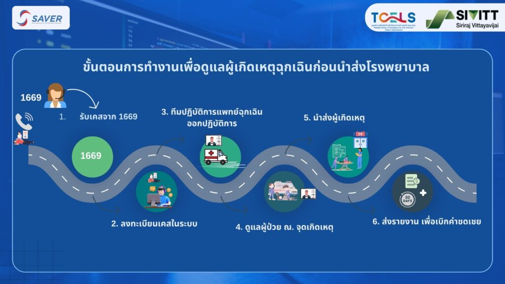 หน่วยปฏิบัติการการแพทย์ฉุกเฉิน สามารถเริ่มปฏิบัติการ EMS พร้อมด้วย ระบบสารสนเทศ การแพทย์ฉุกเฉินนอกโรงพยาบาล SAVER ได้ตั้งแต่ เปิดเคส เมื่อรับงานจาก 1669 ออกปฏิบัติงานพร้อมกับระบบปรึกษาทางไกล ไปจนถึง ส่งรายงานการปฏิบัติงาน เพื่อขอรับค่าชดเชยการปฏิบัติงาน