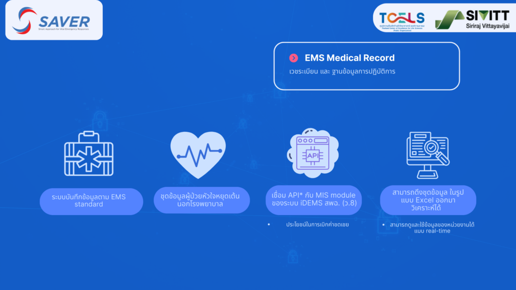 รองรับการเก็บ วิเคราะห์ และแลกเปลี่ยนข้อมูลระหว่างหน่วยงาน EMS ทั่วประเทศ เพื่อใช้ในการวางแผนและวิจัยเชิงนโยบาย